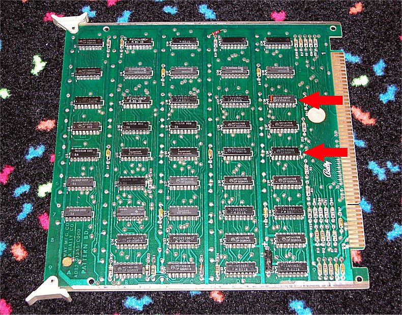 Once the RAM was corrected it was on to the Pattern Board to find out what was causing my graphical display problems. Diagnosing the pattern board is a very tedious process and one tool that is a must is a logic probe set to CMOS. Eventually I was able to find pin #10 stuck low on chip U38 (MC14008) which fed pin #4 on chip U36 (MC14516). I replaced both chips and my graphical error as well as the ship exploding problem both were gone! |